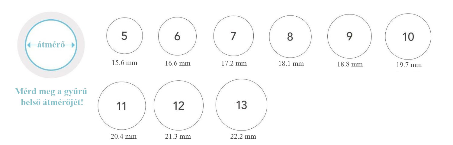 A méret eldöntéséhez nincs szükségünk másra, csak egy mm beosztású vonalzóra, és egy kényelmes, jó méretű gyűrűre. Megmérjük a gyűrű átmérőjét, feljegyezzük a kapott mm-ben kifejezett értéket, és kikeressük a lenti mérettáblázatból a méretünket.