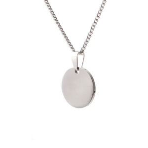 Nemesacélból készült, fényes, érme alakú medál hozzá tartozó akasztóval , ezüst színben amely valódi ezüst hatását kelti.